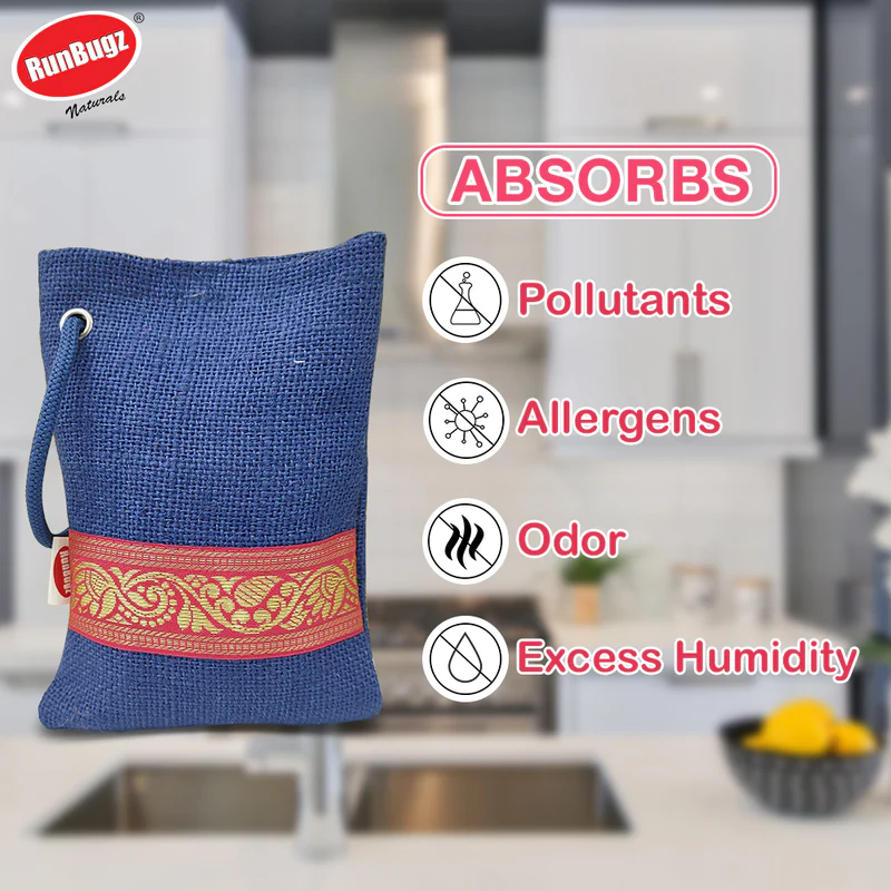 CompareRunbugz activated charcoal air purifiers are manufactured using the natural and high quality coconut shells. The resulting granules are highly absorbent and helps in removing odour, pollutants, excess humidity and allergens, etc. These air purifiers are extremely long lasting and can be reused time and again, up to 3 years-you only need to place the inside pouch in the sun for a few hours once every month to reactivate the charcoal.